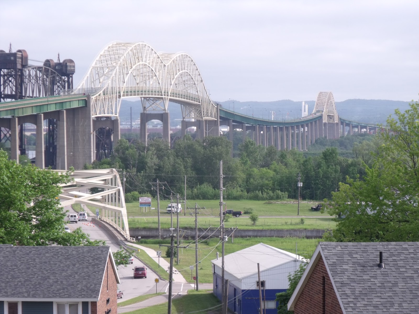 This is a photo of the bridge over the St. Marys river, taken from a lookout point on the campus of Lake Superior State University in the UP.